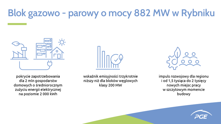 „Inwestycja PGE w Rybniku będzie największym i najbardziej sprawnym blokiem gazowo-parowym w Polsce i jednym z największych w Europie. Będzie on spełniał najbardziej restrykcyjne limity emisyjne wynikające z konkluzji BAT dla bloków gazowo-parowych, a ograniczona niemal do zera emisja pyłu i tlenków siarki istotnie wpłynie na jakość powietrza w regionie rybnickim – mówi Wojciech Dąbrowski, prezes zarządu PGE Polskiej Grupy Energetycznej. – Realizacja projektu da również impuls rozwojowy dla regionu i konkretne miejsca pracy. W szczytowym momencie budowy przewidujemy, że będzie to od 1,5 tysiąca do 2 tysięcy pracowników” – dodaje Wojciech Dąbrowski.